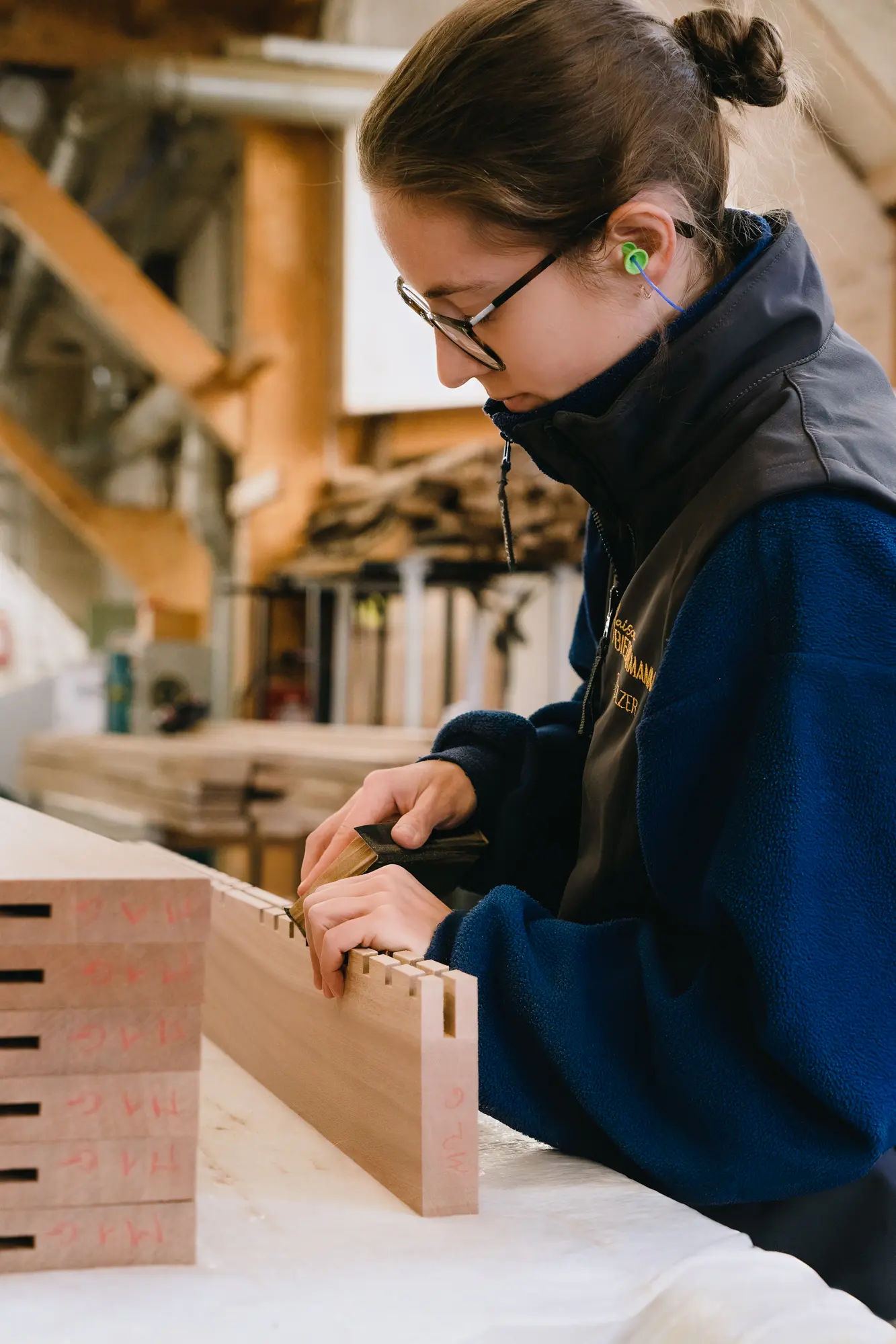 Nos menuiseries sur mesure sont façonnées avec soin dans nos ateliers en Suisse. Escaliers, parquets, agencements intérieurs ou extérieurs : chaque réalisation allie précision artisanale, durabilité et esthétique, pour s’intégrer harmonieusement à votre espace.