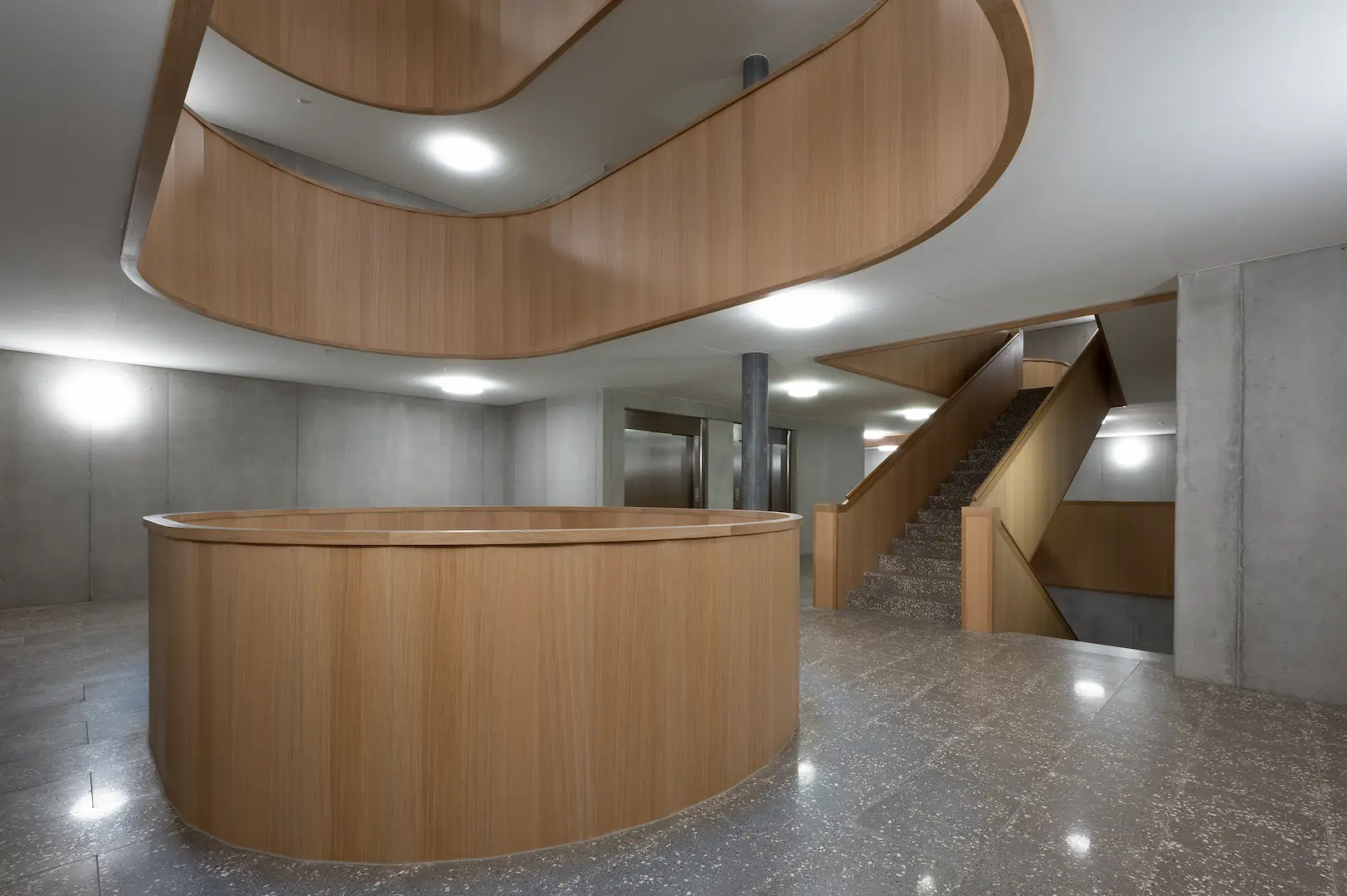 Chaque élément–escaliers, garde-corps, mains-courantes–a été conçu en chêne massif ou plaqué selon les zones. Les détails comme les filières et les aboutages ont reçu une attention particulière pour assurer des transitions lisses. Installation de chantier organisée par phases, minimisant l’impact sur les espaces de circulation. Finitions soignées et cohérence visuelle maintenues sur l’ensemble du projet.