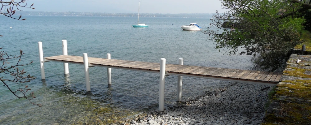 Nous sommes parfois amené à travailler sur des projets plus rares comme ici pour la rénovation d’un ponton en bois pour accès privé au lac. Ce projet a demandé un intérêt particulier pour la conception de structures portuaires stables et durables. Le bois travaillé et traité avec soin garantit une ambiance douce à cet espace, tandis que les pieux assurent une stabilité et une sécurité optimales.