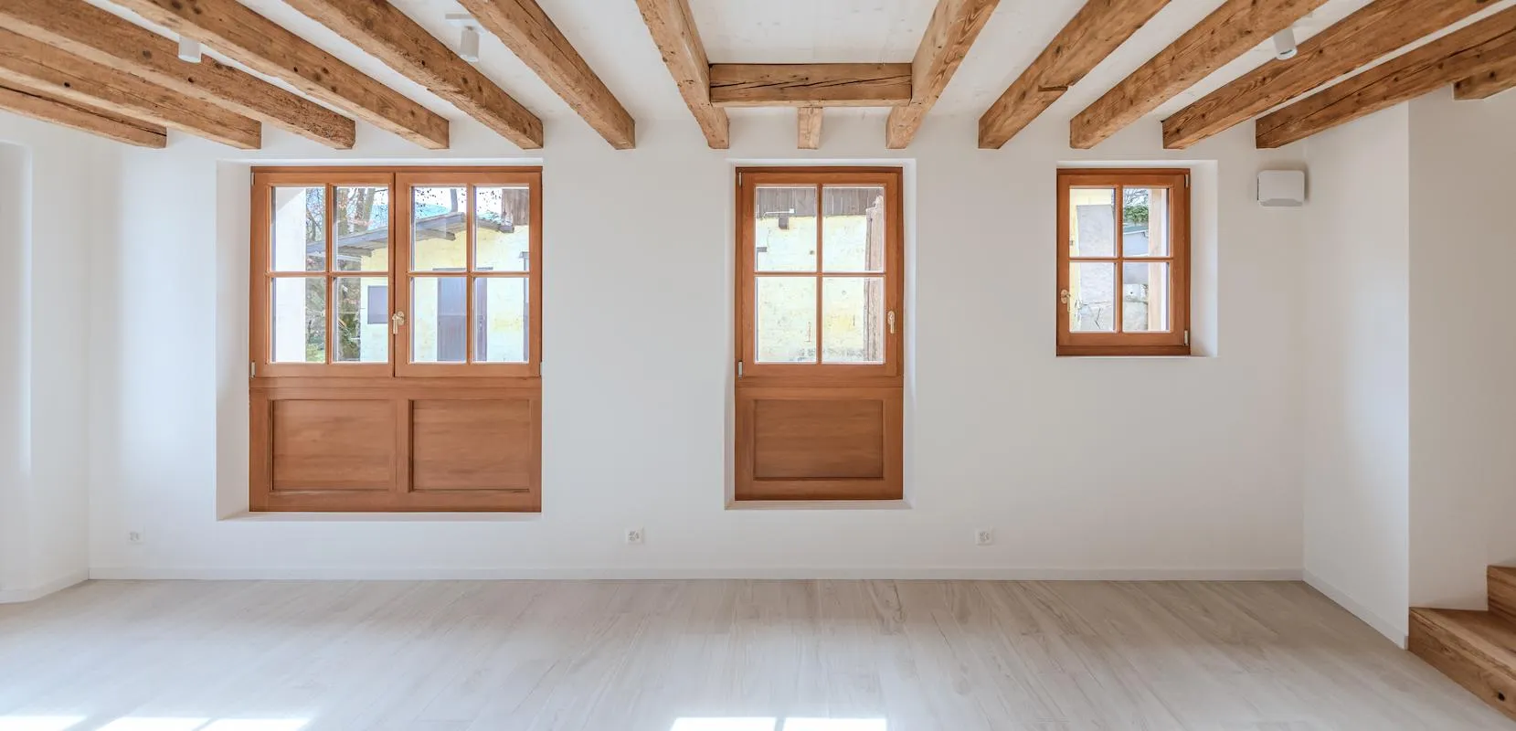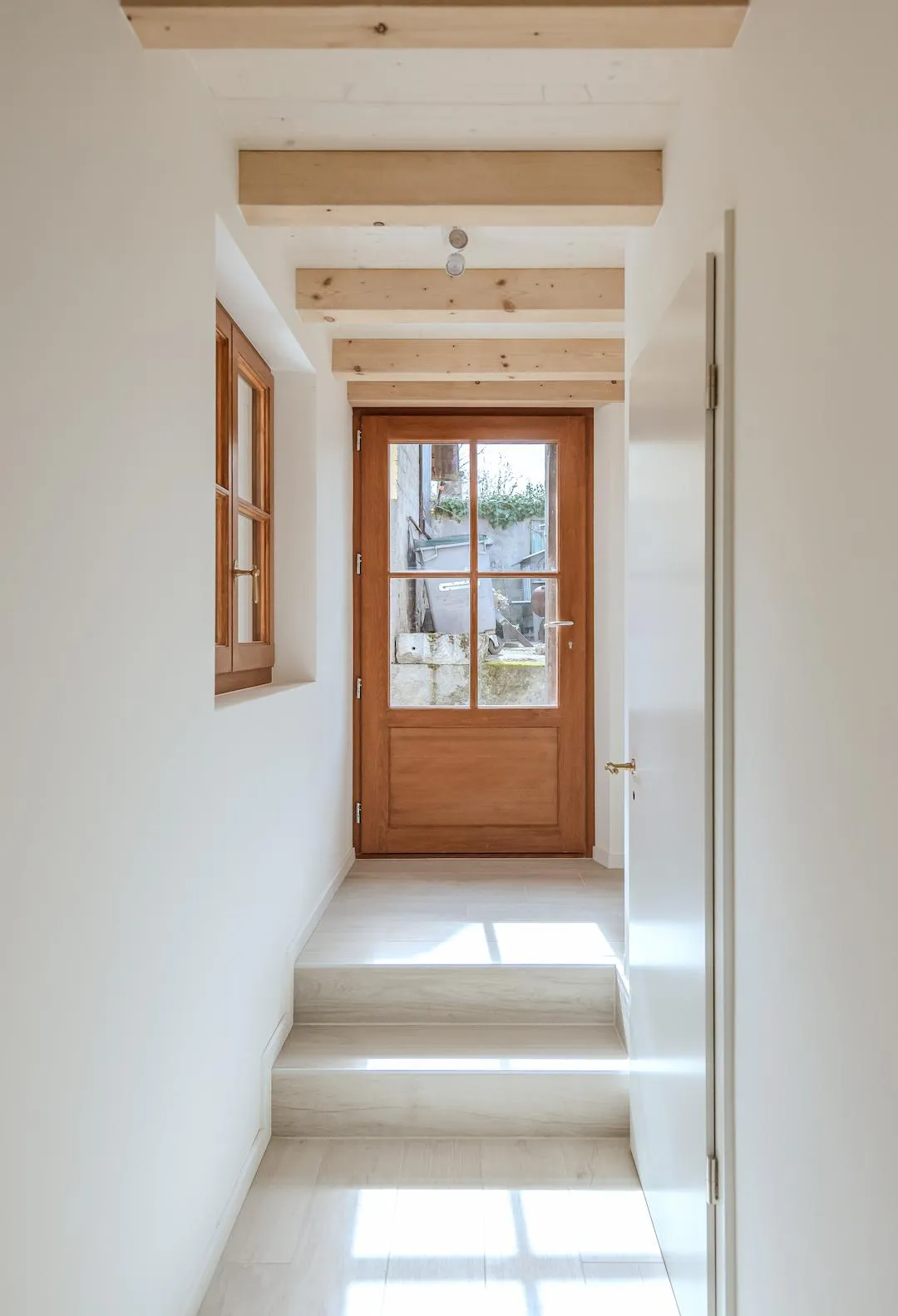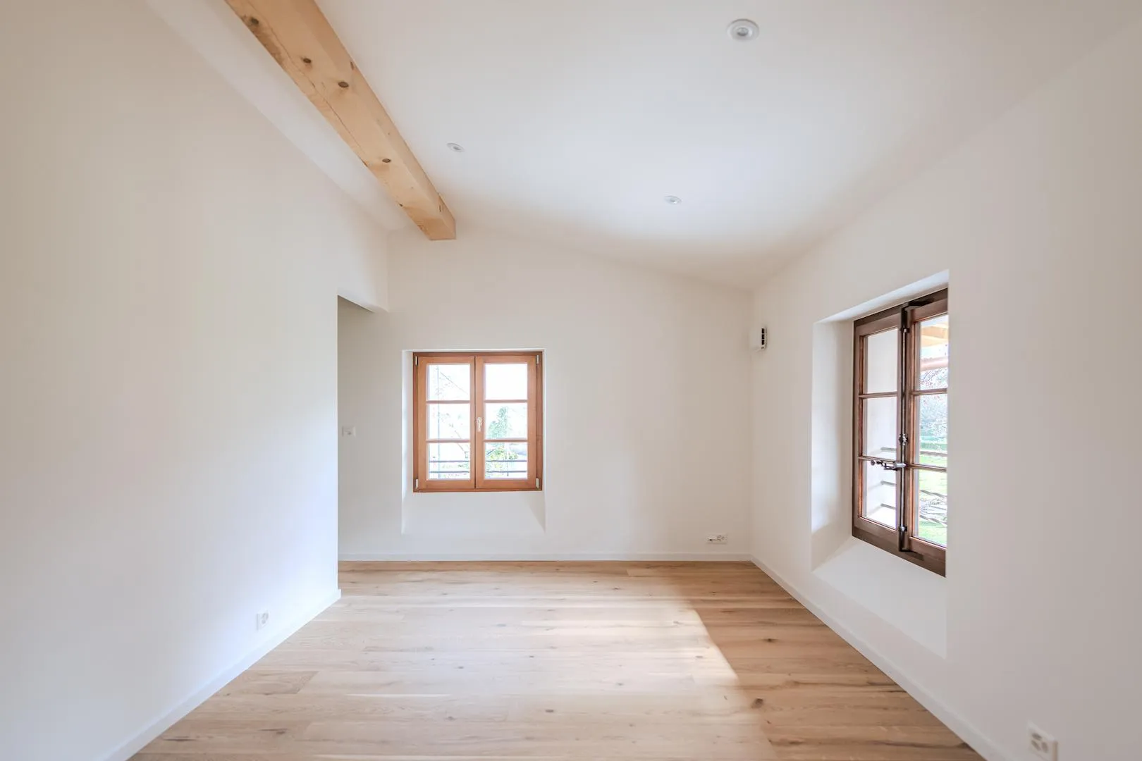 Nous avons privilégié des menuiseries en bois pour la continuité esthétique, notamment en encadrements de fenêtres et portes-fenêtres qui dialoguent avec les structures anciennes. Les portes intérieures ont été choisies dans une finition épurée (laqué blanc et frêne) pour apporter de la clarté, tandis que les poutres apparentes conservent leur patine d’origine.