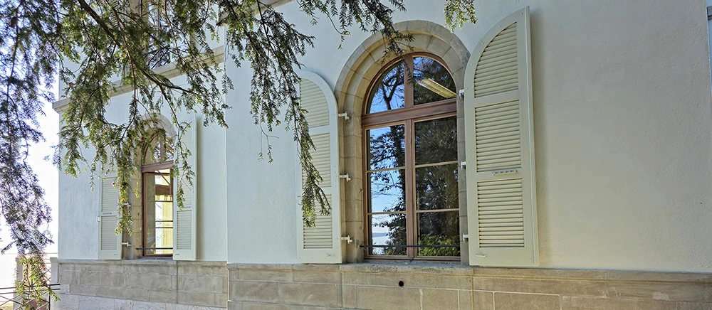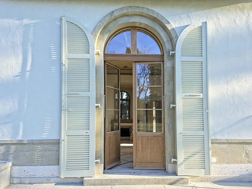 Ce projet de restauration illustre notre engagement pour la préservation du patrimoine bâti genevois. Mandatés par l'Office Cantonal des Bâtiments, nous sommes intervenus sur l'ensemble des menuiseries extérieures d'une villa du XIXe siècle: fenêtres cintrées, portes-fenêtres, volets à persiennes et châssis des combles. L'enjeu était de restituer leur aspect d'origine tout en améliorant sensiblement les performances thermiques et acoustiques du bâtiment classé.